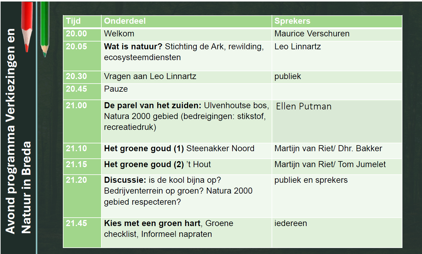 Na de pauze komen behoud van Ulvenhoutse Bos (stikstofeffecten) en Groene Goud gebieden ’t Hout en Steenakker-noord in discussie. Als knelpunten, kansen en keuzes voor een nieuw te kiezen gemeenteraad.